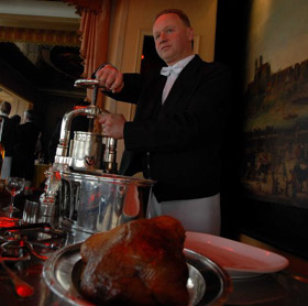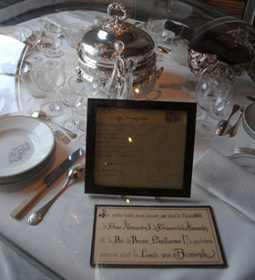 銀樓餐廳總經(jīng)理安德烈·泰拉伊在大廳迎接記者。他首先介紹了窗邊一張?zhí)厥獠妥,上面擺放著特供王室的銀質(zhì)刀叉、器皿和水晶杯等。1867年巴黎世博會期間,俄國沙皇亞歷山大二世、普魯士國王威廉一世和首相俾斯麥三人曾在這張餐桌上大啖血鴨,餐桌及他們使用的餐具從此被銀樓餐廳永久保存。
