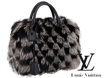 一款蓬松狐貍毛制成的手袋則使用灰黑或棕褐相間的狐貍毛皮拼接,再次表現(xiàn)品牌經(jīng)典的Damier格紋。