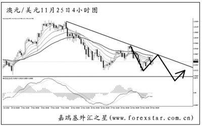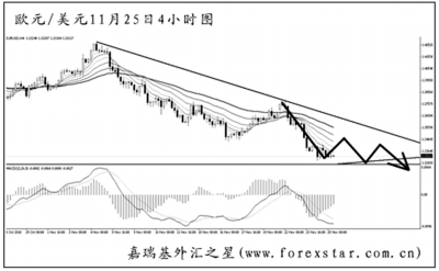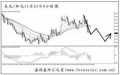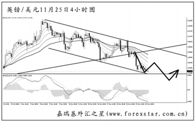 ▲英鎊兌美元在下跌通道中保持完好的下行趨勢,日線圖上升趨勢線已被跌破,目前匯價運行至通道下沿,面臨一定的支撐作用。日線圖道氏理論顯著低點的支撐在1.5650,這也是英鎊接下來要挑戰(zhàn)的一個點位。預(yù)計英鎊將繼續(xù)保持這種震蕩下跌的趨勢,但大幅跌破通道的希望不大。