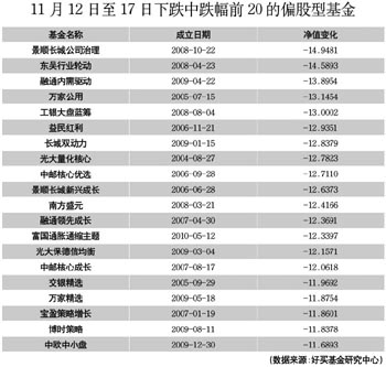 從具體的基金來(lái)看,本輪12日至17日跌幅居前20的偏股型基金中,景順長(zhǎng)城公司治理、東吳行業(yè)輪動(dòng)、融通內(nèi)需驅(qū)動(dòng)、萬(wàn)家公用分別以-14.9481%、-14.5893%、-13.8954%、-13.1454%位居跌幅前四位。