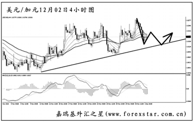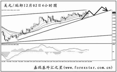 ▲美元兌瑞郎在圖中上升趨勢線的支撐下走高,但短線動能已明顯減弱。同時從日線圖上看,匯價處于一個下跌旗形中繼的上沿下方,能否升破旗形上沿成為美元兌瑞郎后市轉(zhuǎn)為漲勢的關(guān)鍵。目前價格處于被上下夾擊的狀況,建議暫時謹(jǐn)慎入場,最好在突破后采取跟隨的方式交易。