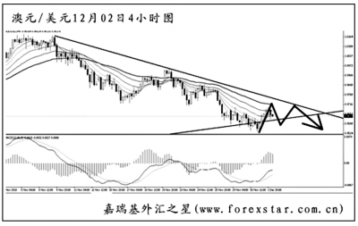 ▲澳元兌美元的下跌已經(jīng)將日線圖均線系統(tǒng)的依托和道氏理論顯著低點(diǎn)的位置雙雙跌破,中線MACD處于空單堅定持倉階段。目前匯價正在考驗大級別上升趨勢線的支撐作用,跌破方可打開進(jìn)一步的下行空間。操作上以再度創(chuàng)出新低后做空為主思路。