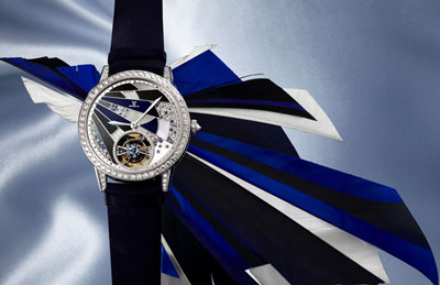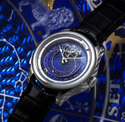 年年初推出的復(fù)雜功能款腕表。腕表完美融合機(jī)械學(xué)與美學(xué),集三種頂級(jí)鐘表復(fù)雜功能于一身,演出一場(chǎng)"天作"之舞:三問報(bào)時(shí)、飛行陀飛輪和恒星萬年歷,共同演繹了獻(xiàn)給威尼斯城的完美舞姿。飛行陀飛輪不僅具有調(diào)節(jié)功能,在展現(xiàn)北半球星空?qǐng)D的藍(lán)色雕紋表盤上,更是恒星時(shí)針。層層疊疊的透明效果凸現(xiàn)了魔幻般的高超手工工藝。太陽圍繞表盤一周恰好24