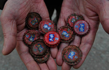 2010年12月7日,今年73歲的李培全手捧廢棄廠房留下的天府可樂瓶蓋唏噓不已。新華社記者 楊磊