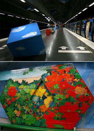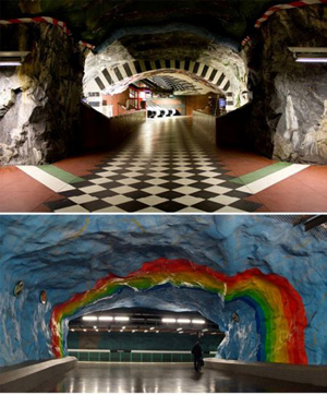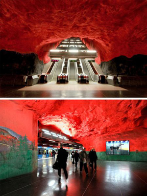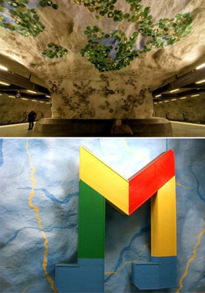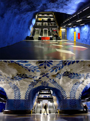 斯德哥爾摩地鐵的幾個(gè)站是在巖石中鑿開(kāi)出來(lái)的,留有洞穴狀的“天花板”。它是古代和未來(lái)的結(jié)合。洞穴繪畫(huà)是其點(diǎn)睛之筆。在其100個(gè)地鐵車(chē)站中,有一半以上裝飾著不同的藝術(shù)品,它們表現(xiàn)著不同的主題,給斯德哥爾摩地鐵增添了生機(jī)勃勃的活力和憧憬。