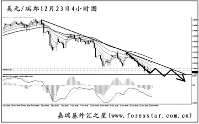 ▲美元兌瑞郎在跌破了日線圖的旗形中繼下沿之后,跌勢被進(jìn)一步確立,圖中下降趨勢線和均線系統(tǒng)的壓制作用完好。現(xiàn)在匯價正在遭遇10月中旬的低點0.9460支撐,若跌破,下方將幾乎沒有能夠阻擋住匯價下跌的點位。操作上以繼續(xù)做空為主,但最好等待支撐被跌破后再行進(jìn)場。