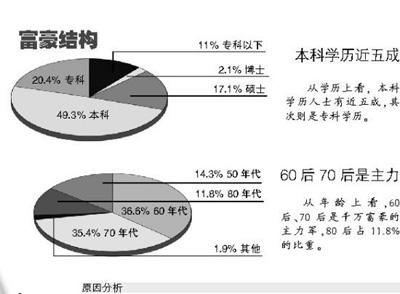 從年齡上看,60后、70后是千萬富豪的主力軍,80后占11.8%的比重。