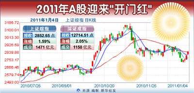1月4日,2011年首個交易日,A股迎來了開門紅。地產(chǎn)股全面爆發(fā),帶動滬指收紅。市場的強(qiáng)勢表現(xiàn)使得多數(shù)分析師對后市比較樂觀,大盤短期仍然有望震蕩向上,但亦有機(jī)構(gòu)提醒投資者需注意一日游行情的可能性。