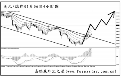 ▲美元兌瑞郎在創(chuàng)出日線圖新低之后強(qiáng)力反彈上行,已經(jīng)將下降通道的上沿大幅升破。日線收出兩根實(shí)體大陽線,即將考驗(yàn)均線系統(tǒng)的壓制位。圖中顯示匯價上漲的斜率陡峭,MACD多頭動能十分充盈,目前正在考驗(yàn)0.9665的道氏理論阻力,升破后將展開更為迅猛的上沖走勢。
