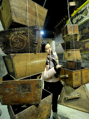 家住重慶市渝中區(qū)枇杷山正街101號(hào)的劉光瑞是一位匾收藏愛好者,他收藏了云、貴、川、渝地區(qū)自明、清以來的各類匾3000余塊,創(chuàng)辦的重慶巴渝名匾文化藝術(shù)博物館預(yù)計(jì)4月正式開館迎客。圖為一觀眾正在館內(nèi)觀賞各個(gè)時(shí)期刻有字的量具“斗”。