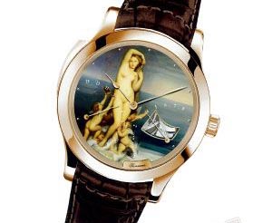 在這枚三問(wèn)表之上,積家選擇了4幅經(jīng)典畫(huà)作之一的愛(ài)神維納斯畫(huà)像為主題,為Master Minute Repeater三問(wèn)腕表的表盤(pán)進(jìn)行琺瑯彩繪裝飾。盤(pán)面的名畫(huà)與三問(wèn)悠揚(yáng)的敲擊聲更突顯其貴族般的氣質(zhì)。定價(jià)超過(guò)200萬(wàn)元,有名畫(huà)、有琺瑯,還有豐富而純凈的報(bào)時(shí)鈴音。藝術(shù)氣質(zhì)超群。