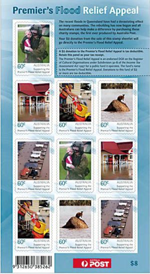 對災(zāi)區(qū)的重建已經(jīng)開始。為了讓所有的澳大利亞人有機(jī)會參與賑災(zāi),籌集資金,昆士蘭州州長安娜·布萊和澳大利亞郵政總裁兼首席執(zhí)行官艾哈邁德·法奧1月25日在布里斯班會展中心宣布,將發(fā)行澳大利亞郵政歷史上的第一種慈善郵票。郵票以小版張的形式發(fā)行,每個小版張含5種圖案的郵票各2枚。郵票面值沒有采用通常附捐郵票面值“郵資+附捐”的形式,為60澳分,但在小版張右下角印有售價8澳元。換句話說,購買每一個小版張,等同捐款2澳元。小版張上方用虛線圍起的部分,是捐款的收據(jù),年底申報個人所得稅時可用于抵扣應(yīng)稅額度。
