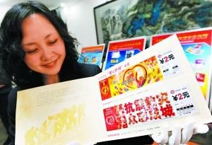 圖為工作人員在展示2008年發(fā)行的抗震救災(zāi)“愛(ài)心附捐”文化車票。