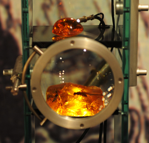 博物館里特別設(shè)置了放大鏡,可以讓參觀者清楚看到蟲珀里的昆蟲。我湊近細(xì)觀,蟲珀里面的昆蟲栩栩如生,好像活的一樣,有的還能清楚地看到它們腿上細(xì)小的毛發(fā)。這些均是數(shù)千萬(wàn)年以前的原始生物,最常見的包裹物是蜘蛛,人們統(tǒng)計(jì)過(guò),琥珀中的蜘蛛多達(dá)267種,其中大多是熱帶或亞熱帶的,有許多早已從地球上消失。端詳著來(lái)自幾千萬(wàn)年前、栩栩如生的小動(dòng)物時(shí),不得不感慨自然的神奇,昆蟲的命運(yùn)最終被定格在這小小的琥珀中,留下永久的紀(jì)念。