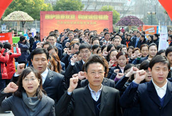3月15日,保險(xiǎn)企業(yè)人員在進(jìn)行誠信服務(wù)宣誓。 當(dāng)日,江蘇省保險(xiǎn)行業(yè)協(xié)會(huì)以及省質(zhì)量協(xié)會(huì)、省消費(fèi)者協(xié)會(huì)等單位在南京鼓樓市民廣場開展“維護(hù)消費(fèi)權(quán)益,構(gòu)建誠信保險(xiǎn)”主題活動(dòng),70多家保險(xiǎn)公司的近300名工作人員現(xiàn)場舉行誠信服務(wù)宣誓和簽名,為市民們提供保險(xiǎn)消費(fèi)權(quán)益、保險(xiǎn)經(jīng)營規(guī)范、信用等方面的咨詢,同時(shí)接受維權(quán)投訴。新華社記者