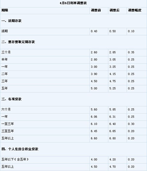 中國人民銀行決定,自2011年4月6日起上調金融機構人民幣存貸款基準利率。金融機構一年期存貸款基準利率分別上調0.25個百分點,其他各檔次存貸款基準利率及個人住房公積金貸款利率相應調整(見附表)。