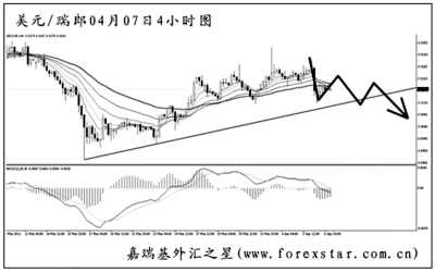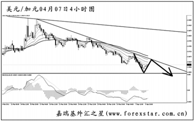 ▲美元兌加元的下跌勢(shì)頭保持良好,再度創(chuàng)出新低之后,將周線圖0.9710的支撐也順利跌破,后市將挑戰(zhàn)的點(diǎn)位是2007年11月初的低點(diǎn)0.9060。圖中下降趨勢(shì)線和均線系統(tǒng)的雙重壓制對(duì)匯價(jià)的反彈造成了很大的影響。預(yù)計(jì)匯價(jià)回探趨勢(shì)線后將繼續(xù)以下行為主。