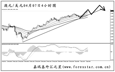 ▲澳元兌美元繼續(xù)創(chuàng)出新高,上升趨勢(shì)線再度下移調(diào)整。圖中均線系統(tǒng)的依托作用完好,澳元的強(qiáng)悍勢(shì)不可擋。由于上方已沒有任何可以阻擋住澳元的點(diǎn)位,所以目前預(yù)測(cè)此波上漲的頂部十分不明智。小時(shí)圖澳元的上漲斜率陡峭,應(yīng)繼續(xù)做多,但止損設(shè)置要嚴(yán)格,警惕匯價(jià)再度跌破趨勢(shì)線發(fā)起回調(diào)的風(fēng)險(xiǎn)。