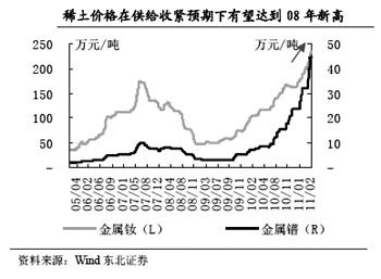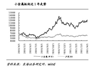 政策支持力度不減,地緣政治動(dòng)蕩頻發(fā),稀貴金屬尚存上漲空間。進(jìn)入2011年,國(guó)家對(duì)稀有戰(zhàn)略金屬的重視和支持力度依然不減,稀土環(huán)保標(biāo)準(zhǔn)的出臺(tái),以及正在醞釀中的資源稅征收辦法,行業(yè)整合的加速以及加快培養(yǎng)和發(fā)展戰(zhàn)略性新興產(chǎn)業(yè)的政策傾斜,都將在“十二五”開(kāi)局之年給稀有金屬帶來(lái)良好的發(fā)展機(jī)遇和發(fā)展空間,有利于進(jìn)一步推升稀有金屬的價(jià)格水平,看好鎢、稀土和鈦等。地緣政治動(dòng)蕩的不斷頻發(fā),也將不斷推升黃金價(jià)格水平。