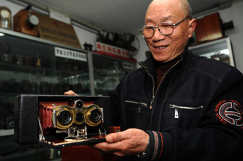 高繼生在收藏館內(nèi)展示一臺立體式古董相機(jī)!∮浾摺↑S宗治/攝 |