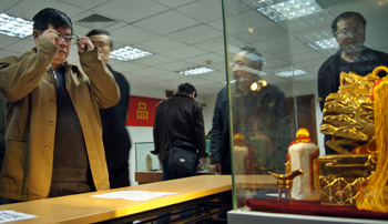 一瓶被譽(yù)為“酒王”的“精裝漢帝茅臺(tái)酒”成交價(jià)高達(dá)890萬(wàn)元,刷新了茅臺(tái)酒拍賣成交價(jià)格的歷史紀(jì)錄。新華社發(fā)(彭年/攝) |