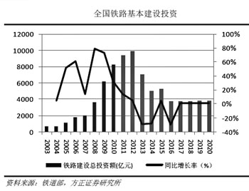 不過也有分析師提醒投資者,短期鐵路建設(shè)呈加速之勢,從長期趨勢來看,鐵路投資的峰值已經(jīng)到來,這同時(shí)也意味著2012年之后鐵路投資的增速可能面臨回落。按照鐵道部中長期規(guī)劃,到2020年鐵路的運(yùn)營里程達(dá)到12萬公里,這意味著未來兩年將完成未來十年工作量的64%。
