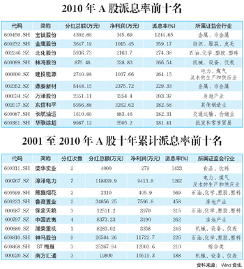 據(jù)統(tǒng)計(jì),2009年前,A股上市公司累計(jì)分紅8892.1億元左右,累計(jì)實(shí)現(xiàn)凈利潤(rùn)43686.85億元,派息率平均為20%,電力、鋼鐵、高速公路企業(yè)派息率最高,介于30%-50%之間。但總體看,我國上市企業(yè)分紅積極性不高,現(xiàn)金分紅的更少,連續(xù)10年從不分紅的企業(yè)有100多家,每年近半數(shù)企業(yè)年報(bào)不提分紅之事,A股“圈錢市”惡名遠(yuǎn)揚(yáng),不少上市公司成為“鐵公雞”。