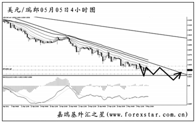▲美元兌瑞郎繼續(xù)平穩(wěn)地一路走低,由于下方已沒有任何可以阻擋住匯價下跌的點位,所以預(yù)測何時見底的風(fēng)險很大。從日線圖上看,匯價仍然受制于最陡的一條下降壓力線,均線系統(tǒng)呈空頭排列。按照目前的情況,匯價首先需要突破圖中的趨勢線才有可能發(fā)生像樣的回調(diào)。交易上繼續(xù)以做空為主。