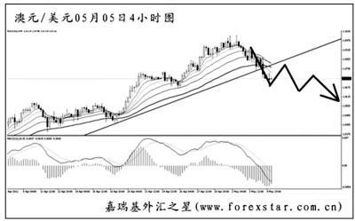▲澳元兌美元瞬間突破1.1000之后迅速回落,短線下跌的力度強勁,并且成功地將4小時圖上升趨勢線跌破。同時,道氏理論的兩個顯著低點1.0860和1.0780均被刺破,若匯價能繼續(xù)沖過1.0675的支撐,則澳元階段性的頂部將基本宣告構(gòu)筑成功。除非新的強上漲動能重新暴發(fā),否則已不適合做多澳元。