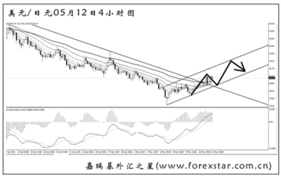 ▲美元兌日元的反彈已經(jīng)將4小時圖的下降趨勢線成功升破,目前形成了一個上升通道,匯價在通道內(nèi)緩步上行。圖中MACD處于多頭動能充盈的階段,道氏高點的阻力在81.20,若站穩(wěn)到此位置上方,匯價將沿通道進一步?jīng)_高。短線關注通道下沿的支撐作用,跌破才可進行做空交易。