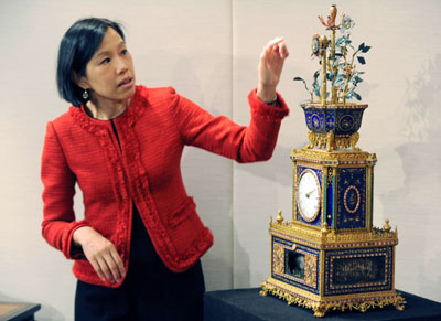 6月1日,香港佳士得拍賣行將在2011年春季拍賣期間舉行“重要中國瓷器及工藝精品”專場拍賣會,本次拍賣將呈獻(xiàn)470多件藝術(shù)珍品,總估值約10億港元(1.28億美元)。 圖為傳媒預(yù)展上工作人員正在介紹清乾隆年間的鎏金銅鑲嵌琺瑯料石轉(zhuǎn)花花盆頂水法音樂鐘,估價1800萬至2500萬港元。