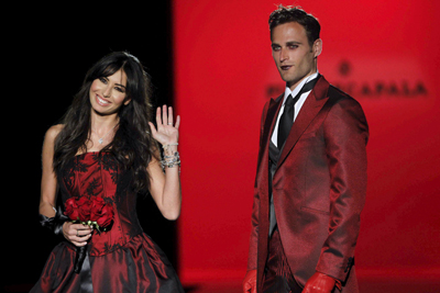 在西班牙巴塞羅那舉行的巴塞羅那婚紗禮服時(shí)裝周上,意大利模特伊麗莎白·格雷戈拉奇(左)身著“Fuentecapala”品牌新娘禮服走秀。本屆婚紗禮服時(shí)裝周于5月10日至15日舉行。