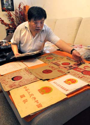 今年50歲的張建洛,是河南省洛陽市的一名普通市民。他從30多年前就開始收藏各種唱片和留聲機。在他收藏的15000多張唱片中,有一套經(jīng)過精心整理的“國歌唱片檔案”格外惹人注目。據(jù)史料記載,《義勇軍進行曲》從1934年誕生,到新中國成立后被定為代國歌、共有16個版本,張建洛收集了所有版本的唱片,包括1934年的電影《風云兒女》插曲《義勇軍進行曲》,1941年美國著名黑人音樂家保羅?羅伯遜演唱的《義勇軍進行曲》,1949年《義勇軍進行曲》作為代國歌在開國大典上演奏的音樂版,1978年經(jīng)過重新填詞的“新”國歌等,張張堪稱經(jīng)典。張建洛準備將他的國歌唱片在建黨90周年時,用它收藏的東方紅牌留聲機播放給市民聽,和大家一起分享歷史的回聲。