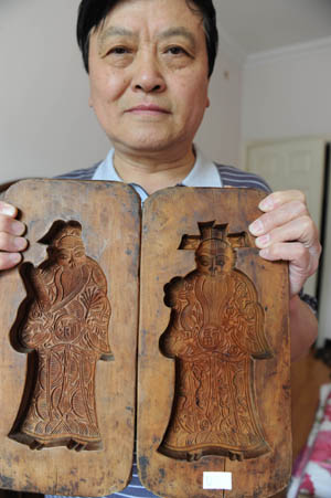 圖為衡水市民翟吉昌正在展示他收藏的一對(duì)“福祿”餅食模印!