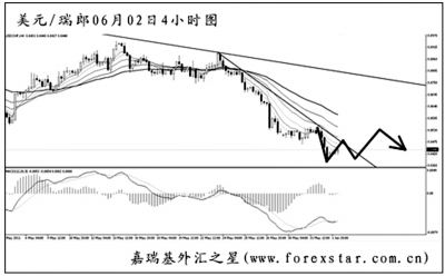▲美元兌瑞郎再度強悍創(chuàng)出新低,由于下方已沒有任何可以阻擋住匯價下跌的支撐位,所以我們無法根據(jù)價位來預(yù)測瑞郎何時能夠見底回升,F(xiàn)在短中線的主客觀方向均向下,操作只能是以繼續(xù)做空為主思路。首先關(guān)注圖中最近一條下降壓力線的阻力,預(yù)計美瑞突破此線的概率較大,進而挑戰(zhàn)0.8550附近區(qū)域。