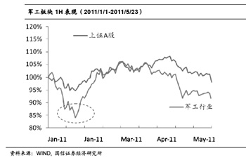 2011年5月份,軍工板塊依然維持弱勢(shì)格局,行業(yè)整體同步于大盤,目前軍工行業(yè)估值水平約為58倍。5月份統(tǒng)計(jì)的40只軍工板塊的股票超過半數(shù)走勢(shì)弱于大盤。我們認(rèn)為軍工行業(yè)依然處于成長(zhǎng)期,具有國(guó)防和民用雙重成長(zhǎng)空間,我們對(duì)行業(yè)持中長(zhǎng)期看好觀點(diǎn),但短期內(nèi)行業(yè)受市場(chǎng)整體估值水平下調(diào)影響依然有調(diào)整壓力,需要繼續(xù)等待調(diào)整后的買入機(jī)會(huì)。