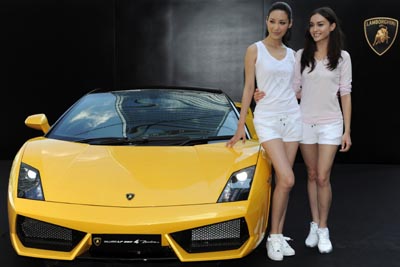全新蘭博基尼Gallardo LP 560-4 Bicolore特別版超級跑車日前正式在香港推出。這款Gallardo跑車采用了雙色面漆,由車頂至車尾發(fā)動機蓋都噴涂黑色車漆,而車身則為橙黃色,突出動感十足的車身線條。該車配備的V10發(fā)動機擁有560匹馬力,從靜止加速至100km/h僅需3.7秒,最高時速可以達到325km/h。圖為模特劉碧麗(右)、姚予睛參加新車發(fā)布會。