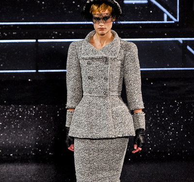 從黑色、灰色到夜空藍,如果只看這一季的作品,實在會讓人覺得Karl Lagerfeld(卡爾·拉格菲爾德)是一位暗色調(diào)的癡迷者。少量的白色服飾也要加入黑色的紋樣裝飾或是籠上一層黑色薄紗,裸露在外的臂部罩上暗色薄紗長手套,佩戴著蕾絲面紗的Chanel(香奈兒)女郎們愈發(fā)神秘。