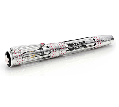 此名筆杰作蘊含歐陸工藝傳統(tǒng),見證了無比浪漫的動人情感;白金筆帽及筆桿有斜方體圖案,并鑲嵌162顆紅寶石及128顆美鉆,與摩納哥國旗色彩呼應(yīng);最大顆的寶石為筆夾上的菱形紅寶石,18K金筆咀有白鴿、戒指及皇冠雕刻圖案,以象征這次歐洲皇室盛事;筆帽頂鑲珍珠貝母萬寶龍星形商標,以示名筆珍罕價值,并賀親王伉儷百年好合,福澤綿長