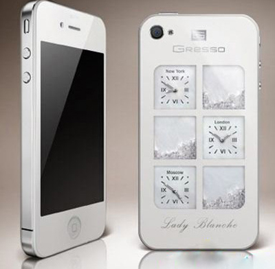 Blanche的iPhone外殼,售價(jià)3萬(wàn)美元。此款外殼背部有三個(gè)時(shí)鐘,以及三個(gè)里面裝了鉆石的小盒子。整個(gè)外套背面由金剛石涂層的礦物玻璃制成。