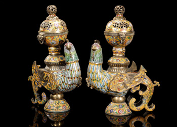 參加“賭賣”的藏品——清銅胎掐絲琺瑯鳳鳥座香薰(一對(duì))。資料照片 |