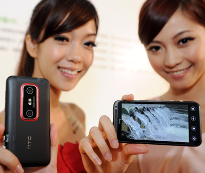HTC(宏達(dá)國(guó)際電子股份有限公司)與臺(tái)灣大哥大在臺(tái)北聯(lián)合發(fā)布首款裸視3D手機(jī)HTC EVO 3D,讓消費(fèi)者感受震撼的裸視3D效果。圖為模特在展示HTC首款裸視3D手機(jī)。