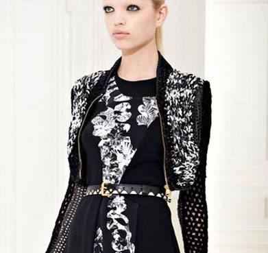 女郎顯得更加優(yōu)雅干練,網(wǎng)眼面料的輕盈感使皮裝不會顯得過于硬朗、沉重。復(fù)古緊身胸衣式的上半身輪廓、柔軟而富有曲線美的裙擺、細密閃亮的金屬扣環(huán)裝飾、清爽和諧的配色,融合成優(yōu)雅而富有藝術(shù)感的氣質(zhì)。連身裙則在不對稱剪裁上大做文章,肩部的挖空設(shè)計、不規(guī)則的裙擺將線條清晰的建筑感與裙裝的飄逸感融為一體,黑白條紋、棕櫚葉子和木槿花圖案作為裝飾,有幾分抽象畫的感覺。