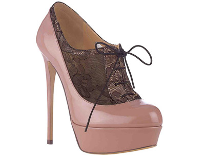 蕾絲依然是Valentino 2011早秋系列重要的設(shè)計元素,在鞋履產(chǎn)品上也不例外。蕾絲網(wǎng)布與漆皮拼接設(shè)計的踝靴復(fù)古優(yōu)雅而不失俏麗;而浮凸刺繡的蕾絲圖案是本季的新舉,搭配粉褐色的皮革顯得更成熟;蕾絲搭配水晶石的晚裝鞋設(shè)計談不上精彩,但足夠精致,露趾高跟鞋、露趾鏤空涼靴和T帶高跟涼鞋三種款式倒是可以滿足各種腳形和服裝搭配。所以2011早秋Valentino的蕾絲鞋總體來講不算驚艷,但也平衡了風格與實用。