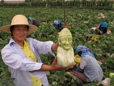 甘肅省武威市農(nóng)業(yè)科學(xué)院技術(shù)人員通過技術(shù)手段成功探索出藝術(shù)葫蘆的種植生產(chǎn)方法,使葫蘆這一農(nóng)作物通過陰干、噴漆等工藝程序成為工人們收藏觀賞的藝術(shù)品。 圖為甘肅武威一位農(nóng)業(yè)技術(shù)人員展示已經(jīng)成熟的藝術(shù)葫蘆。新華社發(fā)