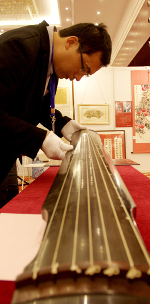 圖為競拍者在欣賞元代朱致遠(yuǎn)制作的“龍吟”款仲尼式古琴。