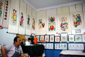 圖為在民間藝人吳百鎖的家里,到處掛滿了他制作和收藏的絳州木版年畫(huà)。 |