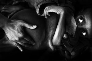 驚恐而無助的眼神,瘦骨嶙峋的手臂,于特雷希特的獲獎(jiǎng)?wù)掌劢沟氖且幻麌?yán)重營(yíng)養(yǎng)不良的男孩!斑@是我在埃塞俄比亞的迪納河邊的一輛救護(hù)車?yán)锱臄z的一張照片,”他介紹說,“由于常年干旱,糧食收成不好,當(dāng)?shù)氐娜藗冮L(zhǎng)時(shí)間處于饑荒之中。這個(gè)小男孩因?yàn)轲囸I和營(yíng)養(yǎng)不良病得非常嚴(yán)重,他的父親萬不得已才帶他來接受無國(guó)界醫(yī)生組織的治療”。