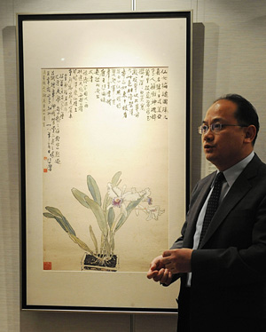 圖為香港佳士得拍賣行中國書畫部專家在介紹徐悲鴻的畫作《胡姬花》。