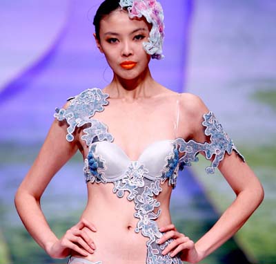 在“歐迪芬”杯2011中國內(nèi)衣設(shè)計(jì)大賽上,東北電力大學(xué)藝術(shù)學(xué)院學(xué)生成龍奪得金獎。圖為模特在展示參賽作品。